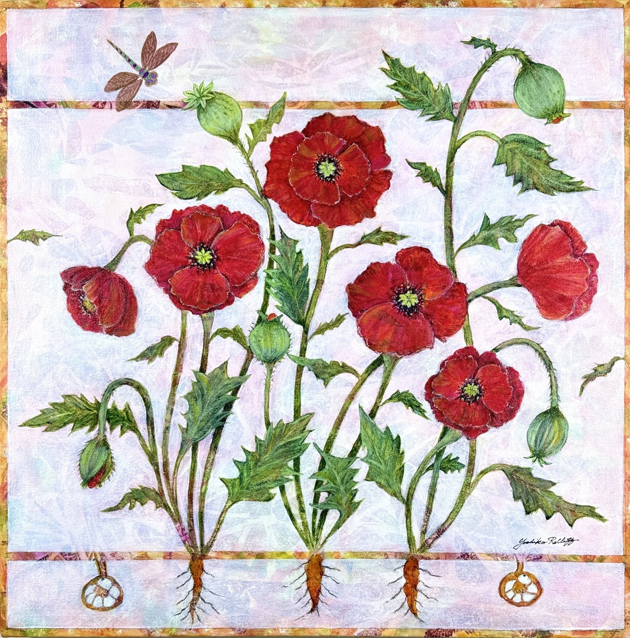 POPPIES WITH DRAGONFLY #2, acrylic, 24" x 24", canvas