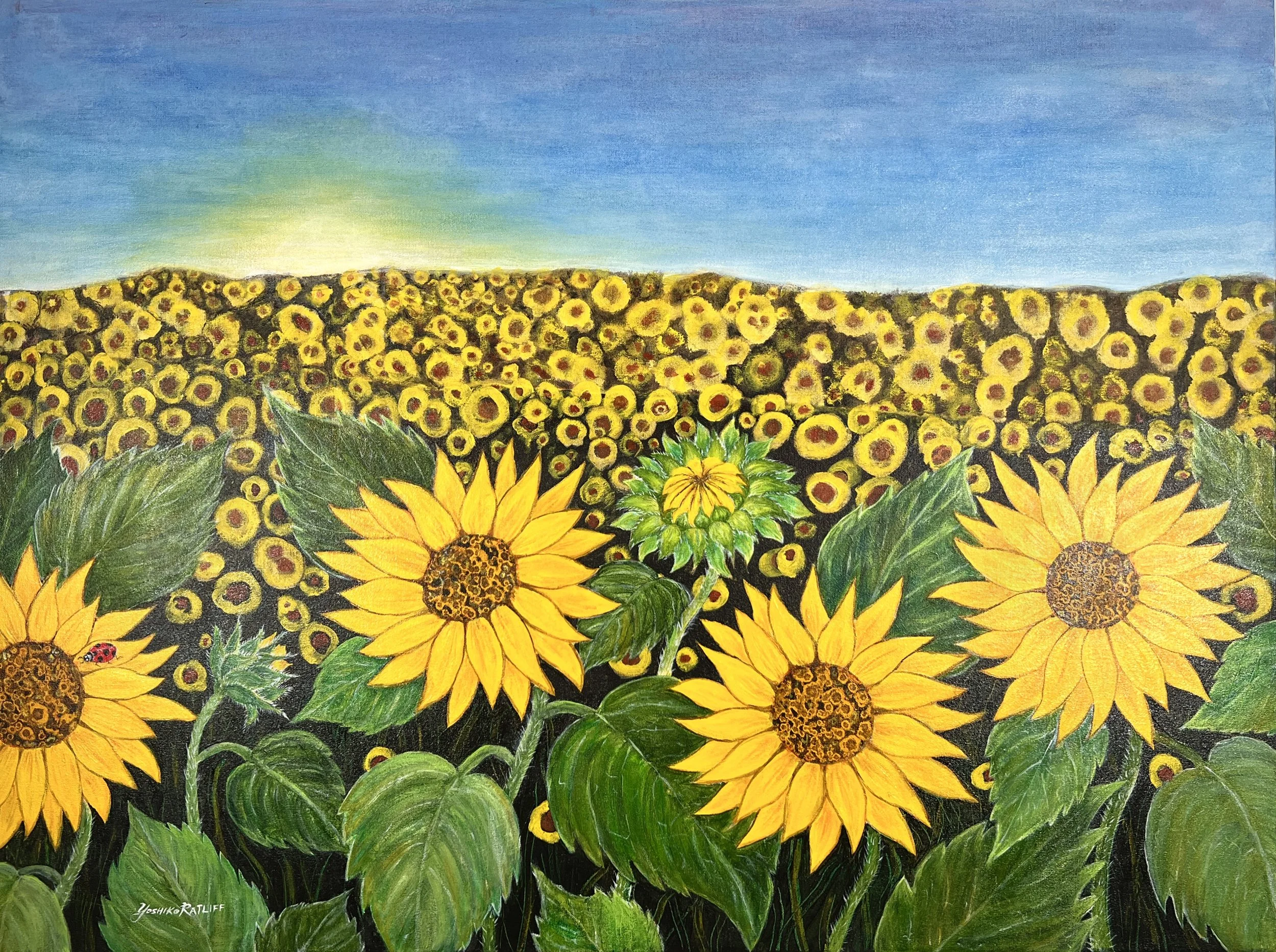 SUNFLOWERS WITH LADYBUG #3, acrylic, 30" x 40", canvas.